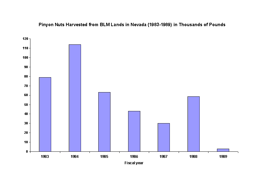 The data on BLM-Nevada's pinyon harvest from 1983 to 1989 was obtained from: Born, J.D., R.P. Tymcio, and O.W. Casey. 1992. Nevada Forest Resources. US Department of Agriculture, Forest Service. Intermountain Research Station. Resource Bulletin INT-76.